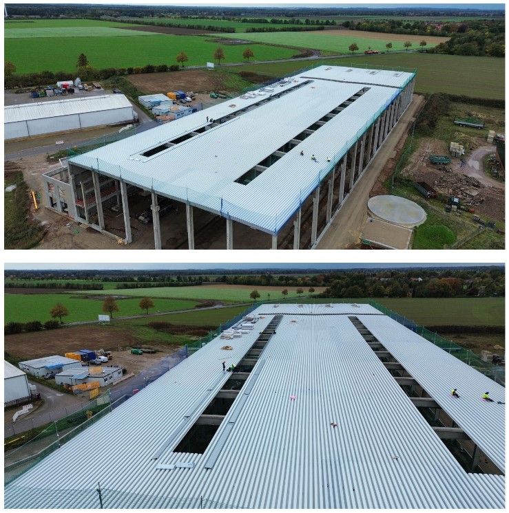 Construction continues with the daily assembly of the prefabricated side panels and the trapezoidal sheet metal for the roof structure, so that the new hall for production and testing is rapidly taking shape.
