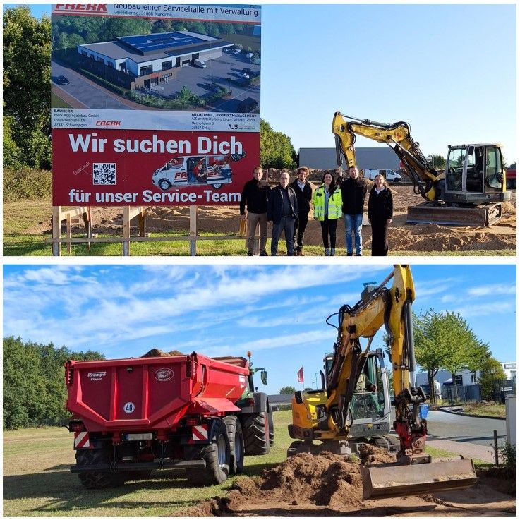 Following the start of construction of the production hall in Schweringen in April, work is now underway in Marklohe: Planned and designed by the architectural firm AJS architekturbüro jürgen schlake GmbH, a FRERK service unit is being built in the Lemke industrial park on a total area of 3,800 m², featuring a nearly 700 m² warehouse and an office building with two floors of 360 m² each.